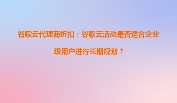 2025-09-16谷歌云代理商折扣:谷歌云活动是否适合企业级用户进行长期规划? 引言 在数字化转型的浪潮中,云计算已成为企业提升运营效率、降低成本的关键工具。谷歌云(GoogleCloud)作为全球领先的云服务提...