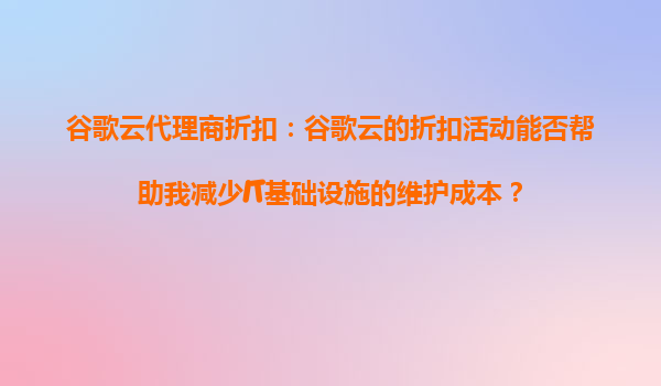 谷歌云代理商折扣:谷歌云的折扣活动能否帮助我减少IT基础设施的维护成本? 引言 随着企业数字化转型的加速,IT基础设施的成本管理成为许多公司关注的焦点。传统的自建数据中心不仅需要高昂的初期投入,还需要持...