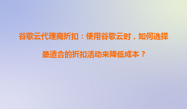 2025-08-21谷歌云代理商折扣:使用谷歌云时,如何选择最适合的折扣活动来降低成本? 云计算已经成为现代企业不可或缺的一部分,而谷歌云(GoogleCloudPlatform,GCP)作为全球领先的云计算服务提供商之一,以其强大的技...