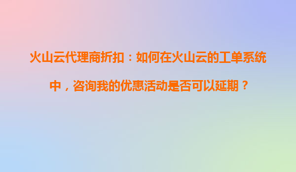 2025-10-31如何在火山云的工单系统中咨询优惠活动延期?全面指南与代理商优势解析 引言 火山云作为领先的云服务提供商,其灵活的优惠政策和高性能的服务备受企业青睐。作为代理商或直接用户,您可能...