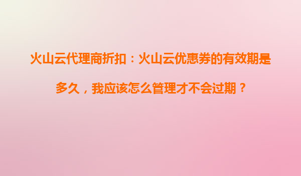 2025-10-21火山云代理商折扣:火山云优惠券的有效期是多久,我应该怎么管理才不会过期? 一、火山云优惠券的有效期解析 火山云优惠券是代理商及用户享受折扣的重要工具,其有效期通常由火山云官方或代理商根据活动规...