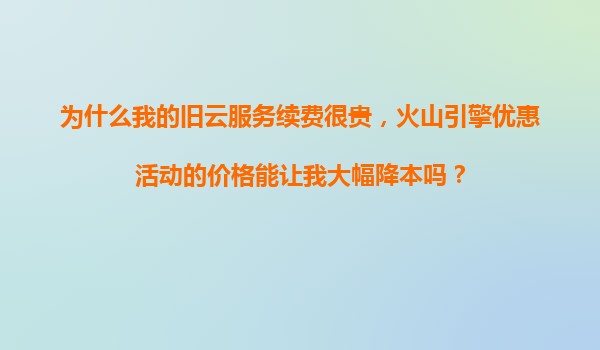 2025-11-05为什么我的旧云服务续费很贵,火山引擎优惠活动能大幅降本吗? 一、传统云服务续费贵的三大核心原因 1.定价机制不透明:传统云厂商早期通过低价吸引用户,但在续费时往往恢复原价,且阶...