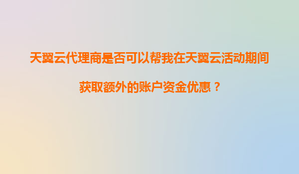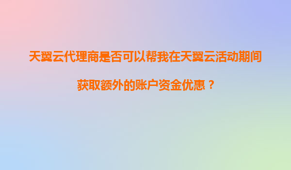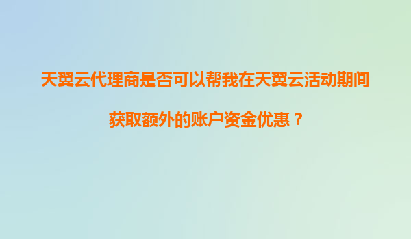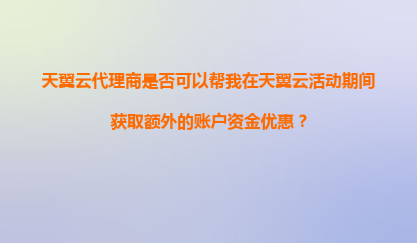 天翼云代理商是否可以帮我在天翼云活动期间获取额外的账户资金优惠? 一、天翼云代理商在活动中的角色与价值 天翼云作为中国电信旗下的云计算品牌,凭借其强大的基础设施、稳定的网络服务和灵活的解决方案...