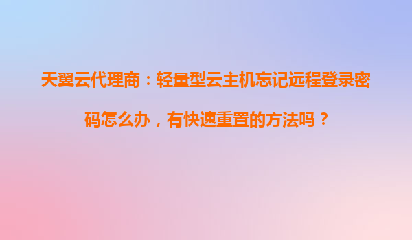 2025-10-28天翼云代理商指南:轻量型云主机忘记远程登录密码的快速重置方法 在数字化时代,云计算已成为企业及个人用户的重要基础设施。天翼云作为中国电信旗下的云计算服务品牌,凭借其稳定的性能、安全的保障和优质的服...
