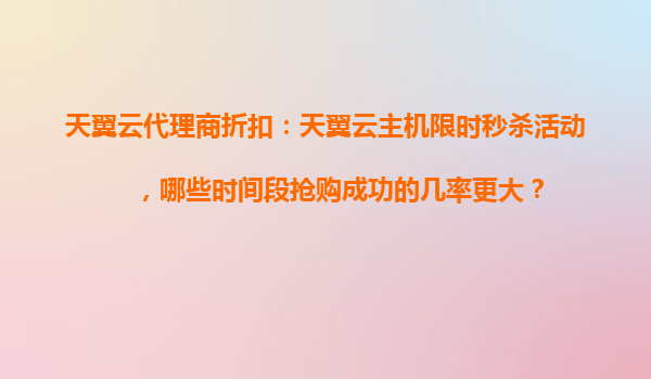 2025-10-27天翼云代理商折扣:天翼云主机限时秒杀活动抢购攻略 抓住这几个时间段抢购成功几率翻倍 在天翼云主机限时秒杀活动中,抢购成功率与时间选择密切相关。根据天翼云历年活动数据分析,以下几个时间段是...